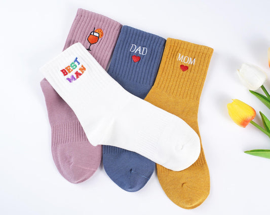 Individuelle Vintage-Socken, bestickte Socken. Unisex-Baumwollsocken mit personalisiertem Textlogo, Mama-Papa-Socken, Partygeschenk, Familiengeschenk.