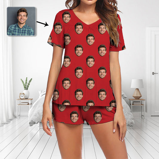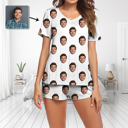 Benutzerdefiniertes Foto-Pyjama-Set kurzärmlig V-Ausschnitt Pyjama Damen-Shorts Pyjama-Set Nachtwäsche Nachtwäsche My Loved's One Face