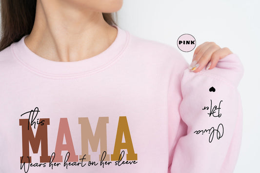 Diese Mama trägt ihr Herz auf dem Ärmel Hoodie, personalisiertes Mama Sweatshirt mit Kindernamen, süßes Mama Outfit, Muttertagsgeschenke
