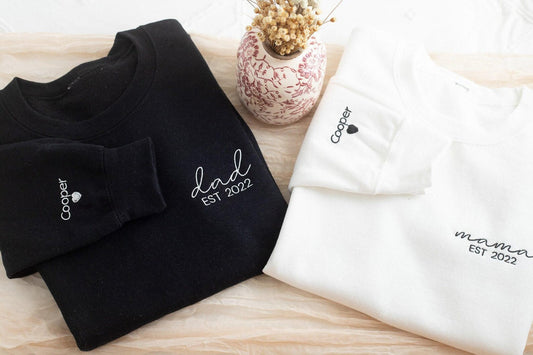 DAD MOM Besticktes Sweatshirt oder Hoodie, Name auf dem Ärmel mit Herz, Dada Mama Crewneck, Geschenk für Papa Mama, Neu-Papa Mama, Daddy Est Year