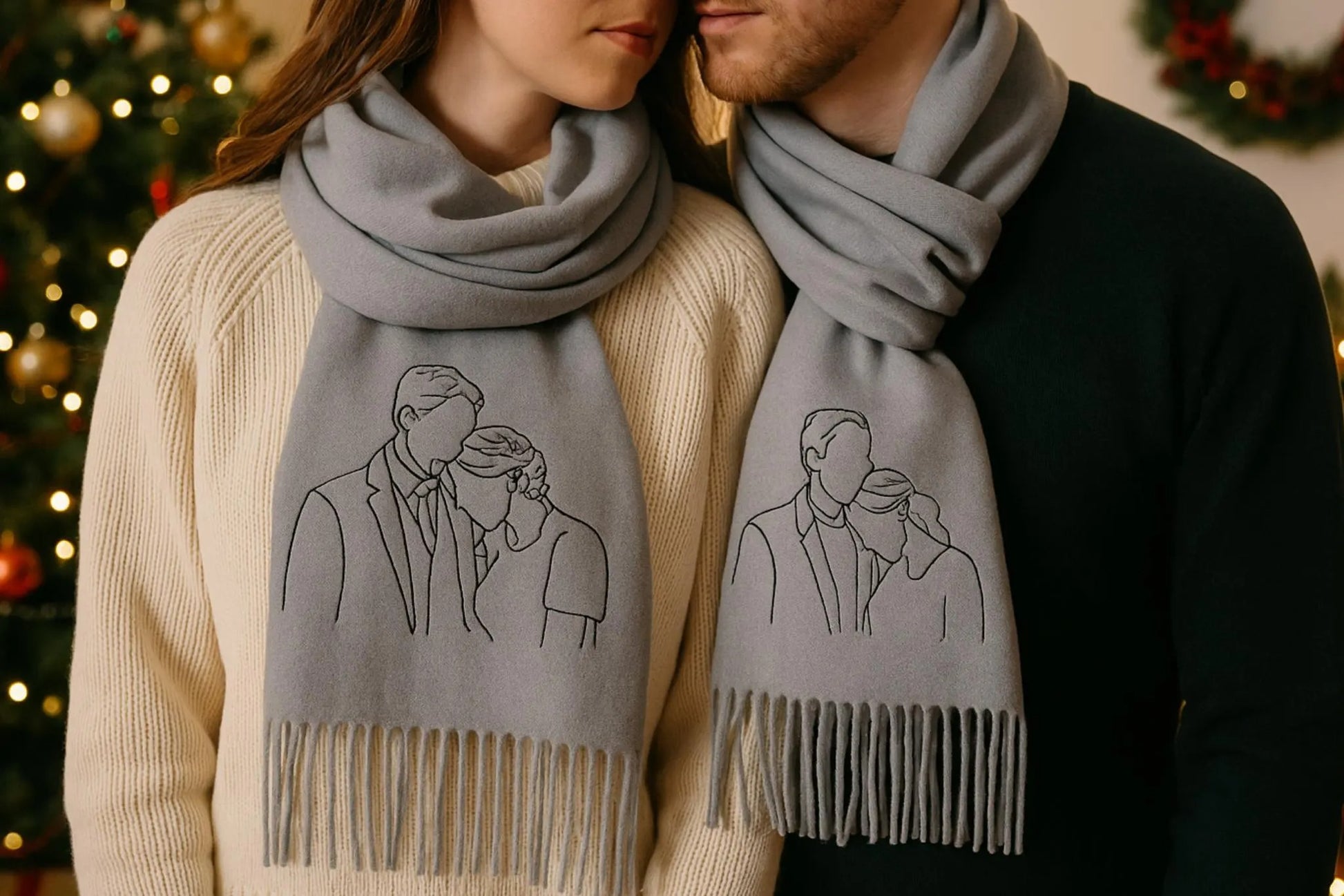 Unser personalisierter bestickter Wollschal verwandelt dein Lieblingsfoto in ein handgesticktes Kunstwerk, das dich den ganzen Winter über begleitet.