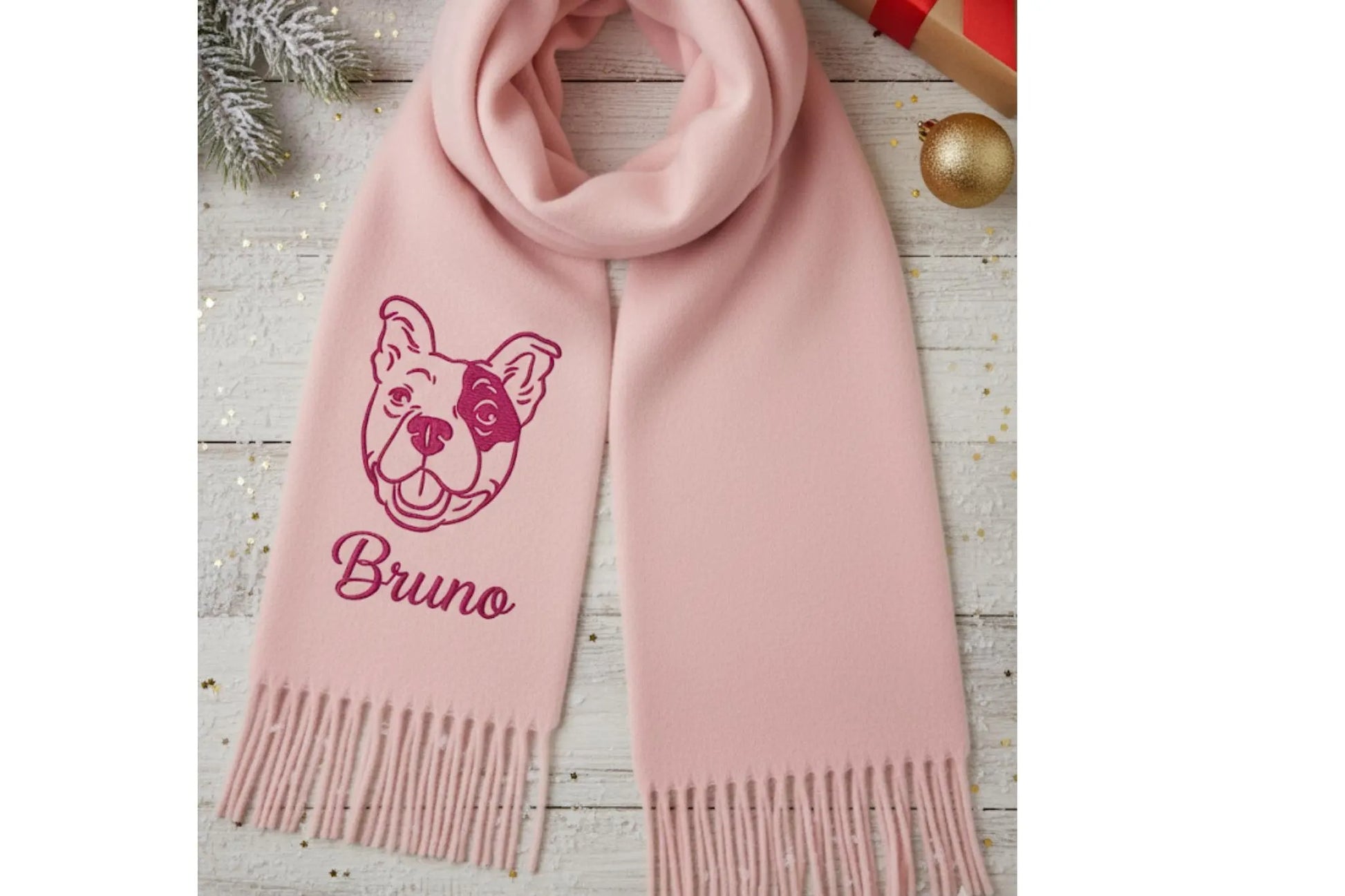 Trage die Liebe zu deinem Haustier ganz nah bei dir – mit unserem bestickten Schal mit Haustierporträt.